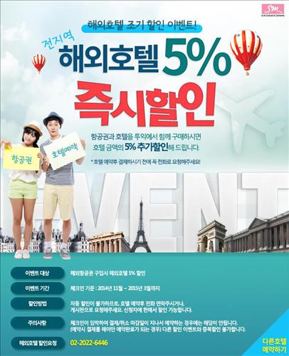 (서울=연합뉴스) 전준상 기자 = SM C&C 투어익스프레스는 해외호텔 5% 할인 이벤트를 진행한다고 2일 밝혔다.