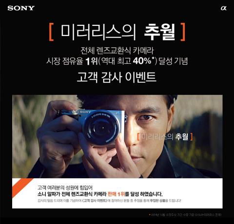 소니코리아는 국내 렌즈교환식 카메라 시장 점유율 40% 돌파와 1위 달성을 기념해 2일부터 15일까지 '미러리스의 추월, 1위 달성 기념 고객 감사 이벤트'를 진행한다.