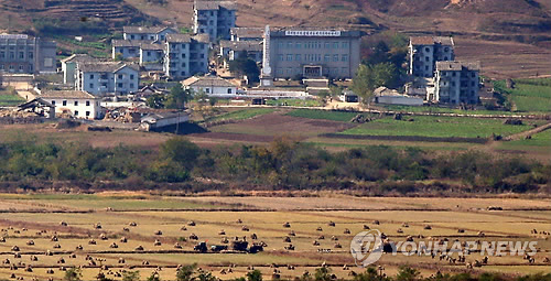 | △ 북한 황해북도 개풍군 봉동면 일대의 논에서 농민들이 트랙터 등을 이용해 모아둔 볏단을 옮기고 있다. (연합뉴스 자료사진) |