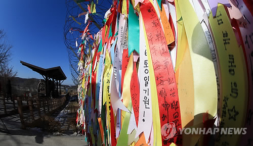 | △ 을미년 새해 첫 날인 1일 오전 경기도 파주 임진각 철조망에 실향민들과 관광객들이 걸어둔 통일 기원 메시지들이 걸려 있다. |