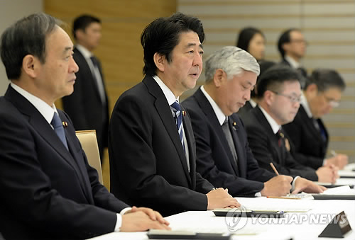 | △ 테러에 절대 굴복 안합니다 (AP/교도통신=연합뉴스) 지난 1일(현지시간) 이슬람 수니파 원리주의 무장단체 이슬람국가(IS)가 언론인인 고토 겐지(後藤健二·47) 살해 주장 영상을 인터넷에 올린 가운데 도쿄 총리 관저에서 아베 신조(安倍晋三, 왼쪽 2번째) 총리가 긴급 각료회의를 주재하고 있다. |