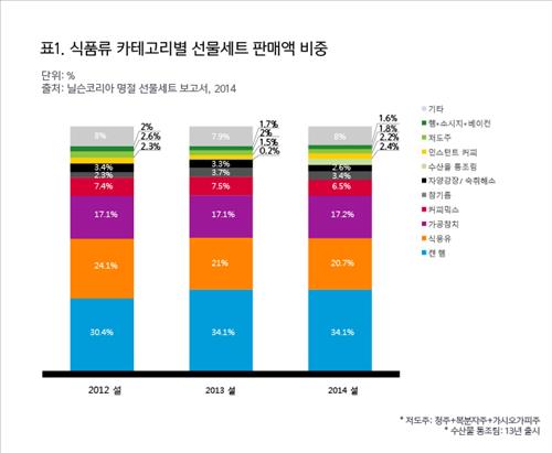 정보분석 기업 닐슨코리아는 4일 내놓은 '명절 선물세트 보고서'에서 작년 설 대형마트와 대형 체인 슈퍼마켓의 선물세트 판매액은 전년도와 비교해 1.9% 줄어든 가운데 식품류 선물세트가 75.7%를 차지했다고 밝혔다.