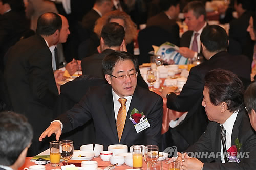 | △ 식약처장-제약업계 CEO 간담회 (서울=연합뉴스) 박지호 기자 = 4일 오전 서울 역삼동 르네상스호텔에서 열린 '2015년 식품의약품안전처장-제약업계 CEO 간담회'에서 정승 식약처장이 참석자들과 환담하고 있다. 2015.2.4 jihopark@yna.co.kr |