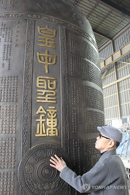 | △ 대만 최대 규모 범종 만든 주철장 원광식씨 (진천=연합뉴스) 변우열 기자 = 중요무형문화재 112호 주철장 기능보유자인 원광식씨가 대만 명성사의 주문을 만든 범종을 살펴보고 있다. 이 종을 제작한 충북 진천군 소재 성종사는 이 범종이 높이 4.82m, 지름 2.89m, 무게 33t으로 대만의 최대 규모라고 설명했다. 2015.2.4 << 성종사 제공 >> bwy@yna.co.kr |