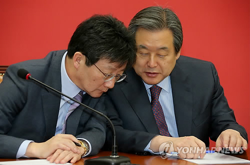 | △ (서울=연합뉴스) 백승렬 기자 = 새누리당 김무성 대표(오른쪽)와 유승민 원내대표가 4일 국회에서 열린 최고·중진연석회의에서 대화하고 있다. |