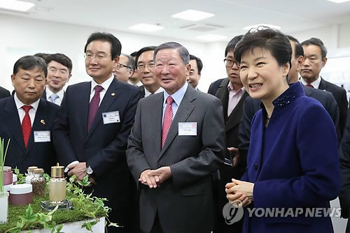 | △ 충북창조경제센터 둘러보는 박 대통령 (청주=연합뉴스) 도광환 기자 = 박근혜 대통령이 4일 오전 충북 청주시 오송읍 충북지식산업진흥원에서 열린 충북창조경제혁신센터 출범식에서 구본무 LG 회장, 최양희 미래창조과학부 장관 등과 함께 화장품 코너를 둘러보고 있다. 2015.2.4 dohh@yna.co.kr |
