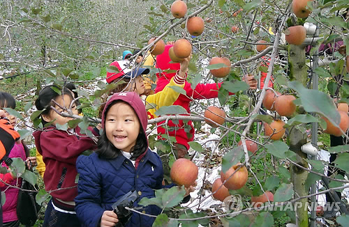 | △ 사과농장 체험모습. <<연합뉴스 DB>> |