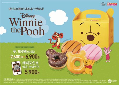 캐릭터 도넛 출시를 기념해 오는 26일까지 '푸' 모양 도넛 팩에 도넛 6개를 담아 6천900원에 판매한다. 해피포인트 앱이 있으면 5천900원에 구입할 수 있다.