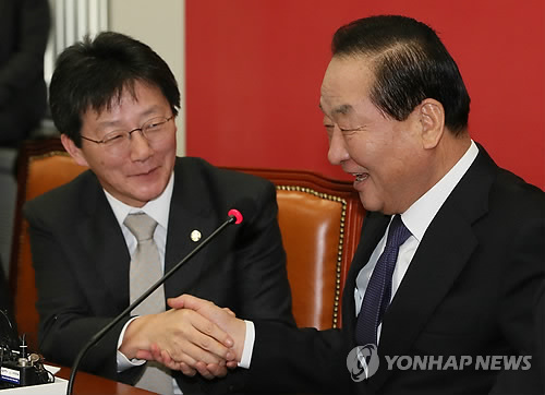 | △ (서울=연합뉴스) 진성철 기자 = 새누리당 서청원 최고위원(오른쪽)이 5일 국회에서 열린 최고위원회의에서 발언하기 전 유승민 신임 원내대표에게 축하악수를 청하고 있다. |