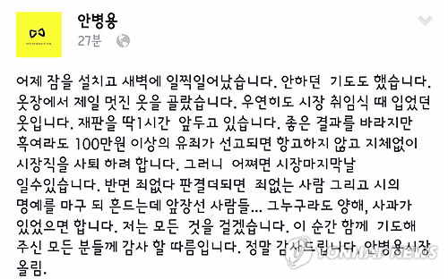 | △ 의정부시장 '시장직 사퇴' 페이스북 글 (의정부=연합뉴스) 안병용 경기 의정부시장이 5일 선거법 위반 사건 결심공판을 1시간 앞두고 페이스북에 '100만원 이상 벌금형이 나오면 항소하지 않고 시장직을 사퇴하겠다'는 내용의 글을 올렸다. 이글은 현재 삭제된 상태다. 안 시장은 이날 결심공판에서 당선 무효에 해당하는 벌금 300만원을 선고받았다. 사진은 안 시장의 페북에 올라온 사퇴 표명글. 2015.2.5 wyshik@yna.co.kr |