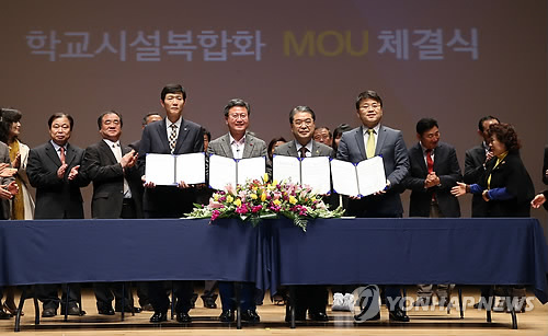 | △ 화성 학교시설복합화사업 업무협약 체결 (화성=연합뉴스) 학생과 주민들이 학교시설과 공공시설을 함께 사용하는 '학교시설 복합화사업'을 위한 업무협약식이 6일 화성 동탄복합문화센터에서 열렸다. 채인석 화성시장(왼쪽에서 두 번째)과 이재정 경기도 교육감(왼쪽에서 세 번째)이 협약서를 들고 포즈를 취하고 있다. 2015.2.6 <<화성시 제공>> hedgehog@yna.co.kr |