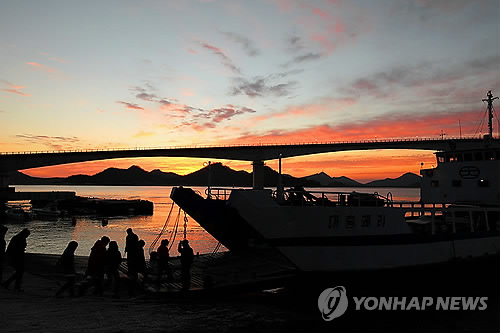 | △ 아름다운 비금도 일출을 배경으로 주민들이 섬과 섬을 잇는 카페리에 승선하고 있다. (성연재 기자) |