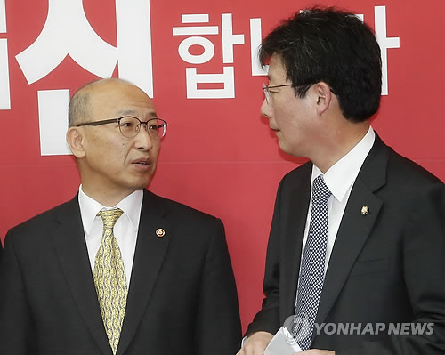 | △ 대화하는 유승민 원내대표와 문형표 장관 (서울=연합뉴스) 이상학 기자 = 새누리당 유승민 원내대표와 문형표 보건복지부 장관이 6일 오후 국회에서 열린 건강보험료 개편 관련 당정 현안보고에서 대화를 하고 있다. |