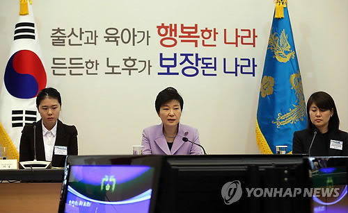 또한 박 대통령은 저출산 고령사회 대응방향과 관련, "출산율이 높아지면 고령화 비율은 줄어들 수밖에 없다"며 "저출산 대책이라기보다는 '일·가정 양립이 가능한 대한민국을 만들겠다'는 것이 더 정확한 목표가 돼야 한다"고 밝혔다.