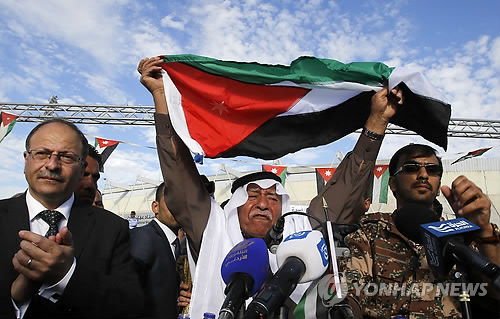 | △ 요르단 시민들이 수도 암만에서 열린 테러 규탄 집회에서 정부의 IS 강경 대응을 지지하는 구호를 외치고 있는 모습. |