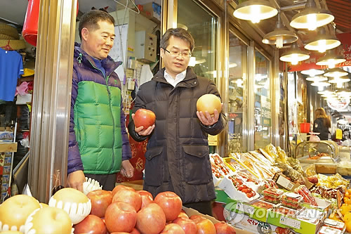 | △ 박형수 통계청장(오른쪽)이 지난 6일 경기도 성남시 중앙시장을 방문, 설맞이 성수품 물가 동향을 파악하고 있다. |