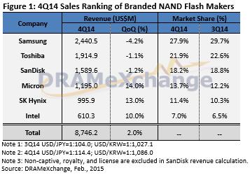 반면, 메모리 시장 부동의 세계 1위 삼성전자[005930]는 낸드플래시 시장에서도 수위를 지켰지만, 작년 4분기 매출이 전분기보다 4.2% 줄어드는 등 성적표는 썩 신통치 못했다.
