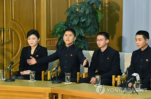 | △ '처형설' 탈북 청소년 기자회견 (평양 조선중앙통신=연합뉴스) 지난해 5월 한국으로 오려다 강제 북송돼 처형설이 제기됐던 탈북 청소년 9명이 12일 평양 고려동포회관에서 기자회견을 하고 있다. 2014.12.12 photo@yna.co.kr |