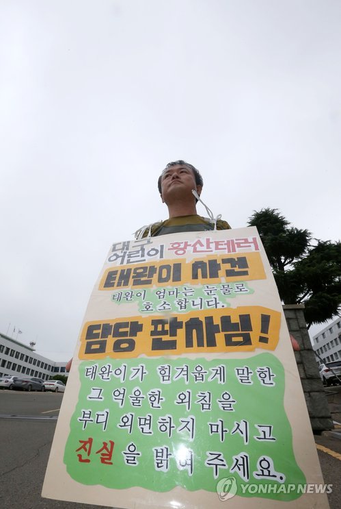 | △ 대구법원 앞에서 피켓을 걸고 1인 시위 하는 태완군 아버지. <<연합뉴스DB>> |