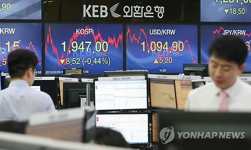 | △ 코스피 1,940선 후퇴 (서울=연합뉴스) 임헌정 기자 = 9일 코스피는 전 거래일보다 8.52포인트(0.44%) 하락한 1,947.00에 거래를 마쳤다. 이날 오후 서울 을지로 외환은행 본점 딜링룸. |
