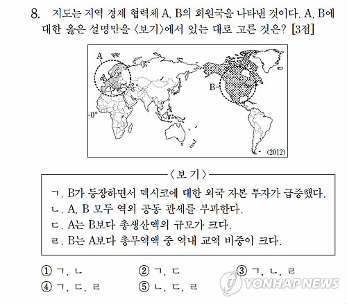 | △ 출제 오류가 발생한 2014학년도 대학수학능력시험 세계지리 8번 문항 |