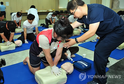 | △ 일선 초·중·고교 보건교사와 체육교사들이 순천향대 의과대학 응급의학과를 찾아 교내에서 발생할 수 있는 안전사고에 대비 심폐소생술 등 응급처치법을 배우고 있다.(순천향대 제공=연합뉴스 자료사진) |
