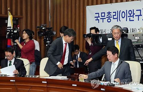 | △ 총리 청문회, 음성파일 공개 논란으로 정회 (서울=연합뉴스) 진성철 기자 = 유성엽 야당 간사(왼쪽)와 정문헌 여당 간사(가운데)가 10일 국회에서 열린 이완구 국무총리 후보자 인사청문회에서 한선교 위원장이 정회를 선언하자 자리에서 일어나고 있다. |