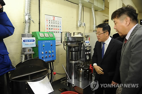 | △ 벤조피렌 함량 낮추는 '참기름 제조장치' 시연회 (서울=연합뉴스) 정승 식약처장이 11일 경기도 구리시 경기방앗간에서 열린 '벤조피렌 저감화 참기름 제조장치' 시연회에서 참석, 시연을 보고 있다. (식약처 제공) |
