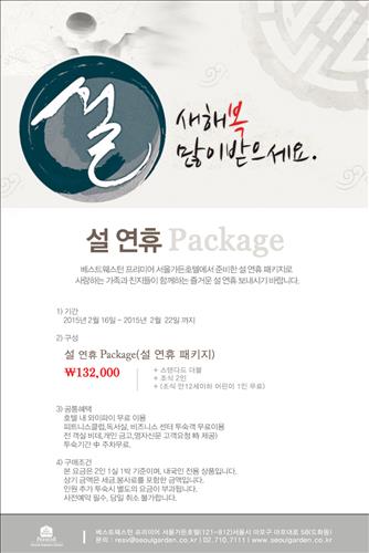 부가가치세와 봉사료를 포함한 가격이 13만2천원인 설 연휴 패키지는 스탠더드 객실 이용권·조식 2인 이용권·12세 미만 어린이 1인 무료 혜택으로 구성돼 있다.