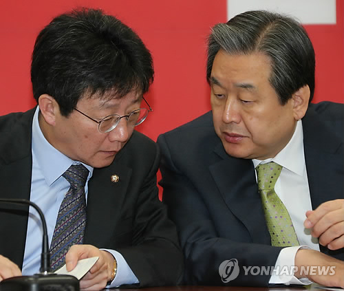 | △ 새누리 지도부 대화 (서울=연합뉴스) 백승렬 기자 = 새누리당 김무성 대표(오른쪽)와 유승민 원내대표가 11일 국회에서 열린 최고·중진연석회의에서 대화하고 있다. |