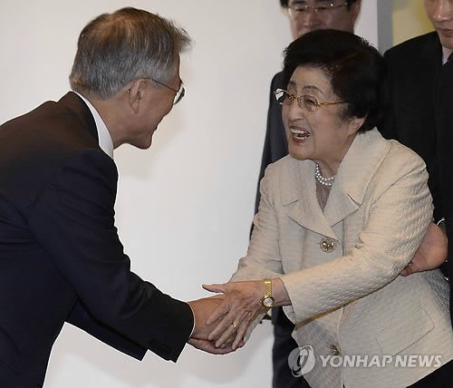 | △ 새정치민주연합 새 지도부, 이희호 여사 예방 (서울 국회사진기자단=연합뉴스) 새정치민주연합 문재인 대표 등 새 지도부가 11일 동교동을 예방, 이희호 여사와 인사하고 있다. |