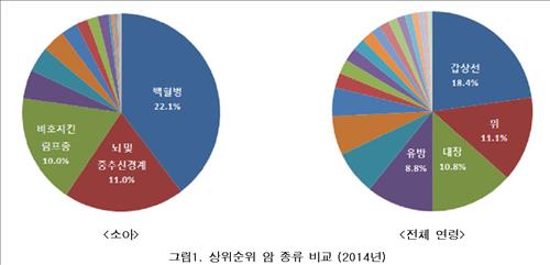 성인을 포함한 전체 연령대에서는 갑상선암, 위암, 대장암 등의 비중이 큰 것과 달리 소아암 환자 중에서는 백혈병 환자가 가장 많았다.