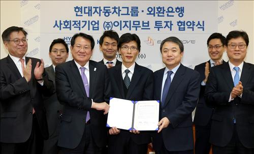현대차그룹과 외환은행은 11일 서 양재동 본사에서 정진행 현대차그룹 사장, 김한조 외환은행장, 오도영 이지무브 대표이사가 참석한 가운데 사회적기업 이지무브에 대한 투자 협약식을 열었다.