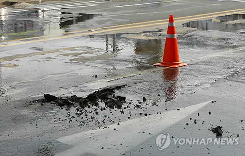| △ 상수도 파열로 내려앉은 도로 (대구=연합뉴스) 김준범 기자 = 11일 오후 대구 동구 서호동 진병원 앞 상수도관이 파열돼 도로 3㎡가 내려앉는 사고가 발생했다. 이 사고로 인근 도로가 물에 넘쳐 주민이 불편을 겪었지만 인명피해는 없었다. |