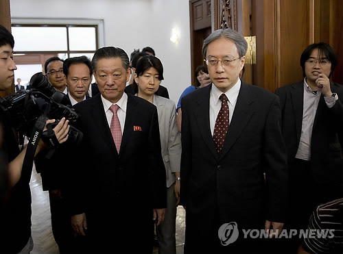 | △ 2014년 7월 1일 중국 베이징의 북한 대사관에서 이하라 준이치(伊原純一, 오른쪽) 일본 외무성 아시아대양주 국장과 송일호(왼쪽) 북한 북일 국교정상화 교섭담당 대사가 납북 일본인 재조사 등을 논의하기 위해 회담장에 들어서고 있다. (AP=연합뉴스DB) |