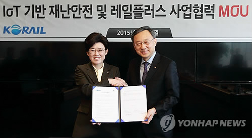 | △ KT-코레일, 사물인터넷 접목해 철도안전 강화 (서울=연합뉴스) 황창규 KT 회장(오른쪽)과 최연혜 코레일 사장이 12일 서울 KT 광화문빌딩 이스트에서 IoT 기반 재난안전기술 및 고객 편의 서비스 분야 협력을 위한 양해각서(MOU)를 체결하고 있다. 두 회사는 철도시설물에 온도·진동센서, 비콘 등을 부착해 철도수송의 안전성을 개선하는 방안을 추진한다. 2015.2.12 << KT 제공 >> photo@yna.co.kr |