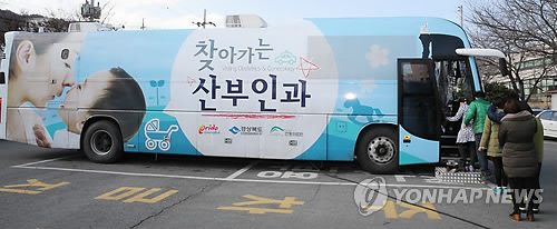 | △ 경북도 '찾아가는 산부인과' (대구=연합뉴스) 경북도가 농어촌지역의 젊은 층이 도시로 나가고 저출산 현상이 심각해짐에 따라 출산의료 서비스를 제공하기 위해 운영하는 '찾아가는 산부인과' 이동 진료 차량. 그동안 500회 진료를 실시했으며 진료를 받은 인원은 1만1천459명이다. 2015.2.12 << 경북도 >> haru@yna.co.kr |