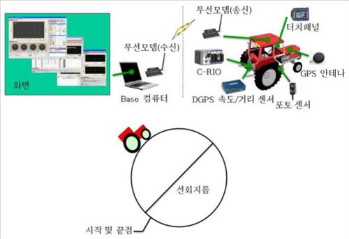 트랙터를 한바퀴 회전시키는 데 필요한 최소반경을 측정할 때 기존에는 회전시 나타난 앞바퀴의 궤적을 줄자로 측정했는데 이를 위성위치확인시스템(GPS)을 이용하는 방식으로 개선한 것이다.