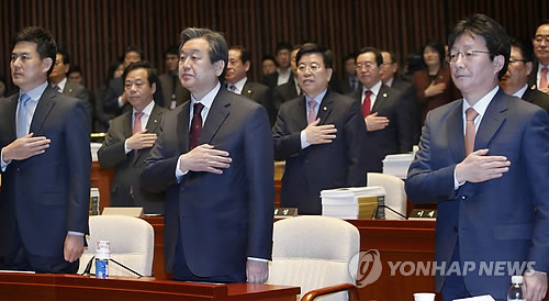 | △ 새누리당 의원총회 (서울=연합뉴스) 이상학 기자 = 새누리당 김무성 대표와 의원들이 12일 오전 국회에서 열린 의원총회에서 국기에 대한 경례를 하고 있다. |