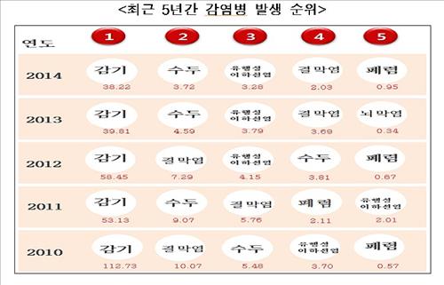 12일 보건복지부 질병관리본부와 보건교사회가 발표한 '2014년도 학교감염병 감시체계 운영 결과'에 따르면 작년 감기는 학생 1천명당 38.22명에게서 발생해 발생률이 가장 높았다.