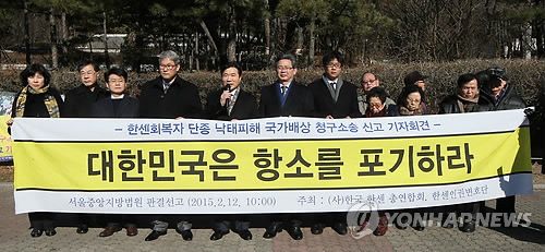 | △ '대한민국은 항소를 포기하라' (서울=연합뉴스) 박지호 기자 = 한국한센총연합회와 한센인권변호단 관계자들이 12일 오전 서초동 서울지방법원 앞에서 한센 회복자들에 대한 강제 '낙태'·'단종'에 따른 국가배상 청구소송의 1심 선고에 관한 기자회견을 하고 있다. |