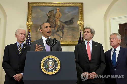 | △ (AP=연합뉴스) 11일(현지시간) 미국 워싱턴DC 백악관에서 버락 오바마 미 대통령이 수니파 극단주의 무장단체 '이슬람국가'(IS)에 대한 대응에 관해 말하고 있다. 조 바이든 부통령(왼쪽)과 존 케리 국무장관(오른쪽 2번째), 척 헤이글 국방장관이 배석해 있다. 오바마 대통령은 이날 IS를 상대로 군사력을 동원할 수 있는 3년 기한의 무력사용권(AUMF·Authorization for the Use of Military Force)의 승인을 의회에 공식 요청했다. 인질 구출작전이나 IS 수뇌부 제거작전처럼 제한적이고 한시적인 작전에 특수부대를 투입하려는 것으로, IS 격퇴 작전의 일부 전략적 변화를 의미한다. 오바마 대통령의 무력사용권 승인 요청으로 미 의회는 13년 만에 전쟁 권한 법안을 심의·표결하게 됐다. bulls@yna.co.kr |