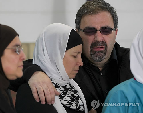 | △ 美서 무슬림 3명 피살 (AP/뉴스 앤드 옵서버=연합뉴스) 11일(현지시간) 미국 노스캐롤라이나주 랄리 기자회견장에서 전날 백인 남성의 총격으로 아들 데아흐 샤디 바라카트(23)를 잃은, 나메 바라카트씨(오른쪽)가 눈을 감은 채 아내와 슬픔에 겨워하고 있다. 용의자 백인 크레이그 스티븐 힉스(46)는 주차 문제로 같은 아파트 단지 거주자인 노스캐롤라이나 대학 치대생 바라카트와 그의 아내 유소르 아부 살하(21), 살하의 여동생 라잔 무함마드(19)를 총으로 쏴 살해하고 경찰에 자수했다. 피살자가 모두 이슬람교 신자인 것과 관련해 경찰은 종교 증오범죄 여부도 수사하고 있다. |