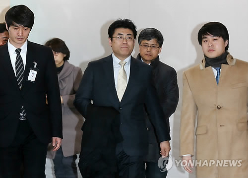 | △ 법원 나서는 산케이 전 지국장 (서울=연합뉴스) 이지은 기자 = 박근혜 대통령의 세월호 참사 당일 행적에 의혹을 제기해 명예훼손 혐의로 기소된 일본 산케이신문 가토 다쓰야 전 서울지국장(가운데)이 13일 오전 서울 서초구 양재동 서울행정법원에서 열린 출국정지기간 연장처분 집행정지 사건의 심문기일에 출석한 후 법원을 나서고 있다. |