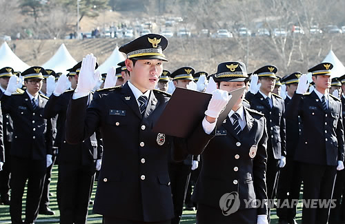 | △ 선서하는 중앙경찰학교 졸업생 대표 (충주=연합뉴스) 전창해 기자 = 13일 충북 충주시 수안보면 중앙경찰학교 대운동장에서 열린 신임 경찰관 제281기 졸업식에서 졸업생 대표가 선서를 하고 있다. |