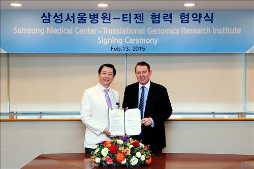 (서울=연합뉴스) 김길원 기자 = 삼성서울병원은 미국의 신약개발 연구기관인 티젠(Tgen)과 유전체 기반의 맞춤형 암 치료제를 공동 개발하는 내용의 양해각서(MOU)를 교환했다고 13일 밝혔다.