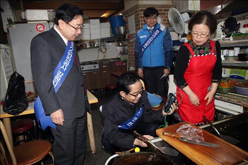 | △ 박기동 가스안전공사 사장(왼쪽 두번째)이 13일 강원도 원주 명륜동 남부시장을 방문해 가스시설을 점검했다. |
