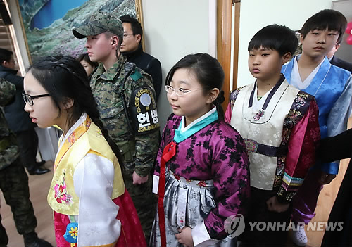 | △ DMZ 안에서 열린 졸업식 (파주=연합뉴스) 서명곤 기자 = 14일 오후 경기도 파주시 군내면 대성동초등학교에서 열린 졸업식에서 졸업생들이 행사장으로 입장하고 있다 . 대성동초등학교는 비무장지대(DMZ) 유일한 학교로 올해 남·녀 2명씩 모두 4명이 졸업장을 받았다. |