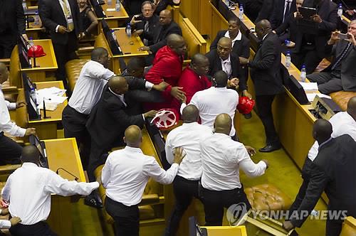 | △ 12일(현지시간) 제이콥 주마 대통령의 국정 연설 도중 경제자유투사당(EFF) 줄리어스 말레마 대표(가운데)가 흰 셔츠를 입은 보안 요원들에 의해 국회에서 끌려났다. (EPA=연합뉴스) |