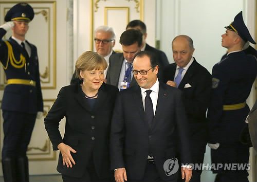 | △ 유럽, 한시름 놨네요 (AP=연합뉴스) 12일(현지시간) 벨라루스 수도 민스크의 러시아·우크라이나·프랑스·독일 4개국 정상회담에서 우크라이나 사태 해결을 위한 마라톤 협상을 마치고 앙겔라 메르켈(앞 왼쪽) 독일 총리와 프랑수아 올랑드 프랑스 대통령이 회의장을 나서며 담소하고 있다. |